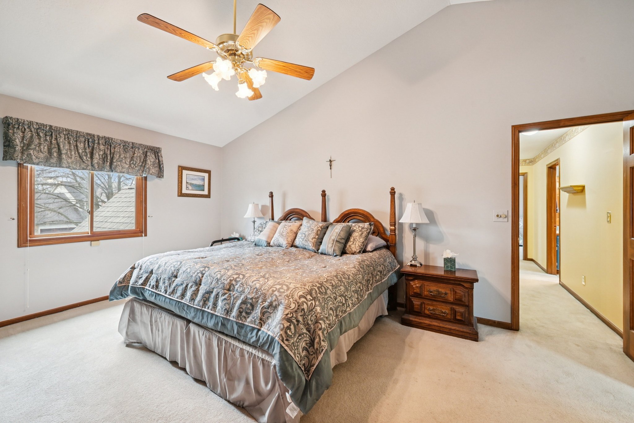 The home showcases quality craftsmanship and detailed woodworking throughout, with a layout designed for both everyday living and entertaining. The main level features a living room, formal dining room, and a stunning vaulted family room with a brick fireplace and abundant natural light. The spacious kitchen offers ample prep and storage space and connects seamlessly to the homeโs gathering areas.